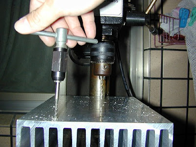 另外一種比較快速的方式是用低轉速的充電電鑽,夾住攻牙鑽頭來攻牙,不過只適用比較薄的鋁板,我自己用230轉/分的充電電鑽在3mm厚的鋁角材攻4mm的螺絲孔是能輕易的過關,而且相當快,平均一個孔 15秒內可以完成。但對於較厚的鋁材或是較細的攻牙鑽針最好不要輕易嘗試.......